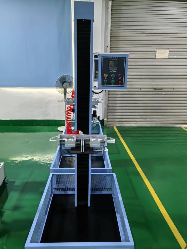本机采用气动结构,将被测试件置于专用夹具(可调行程)夹牢,按下跌落键,气缸松开,试件将作自由落体试验。