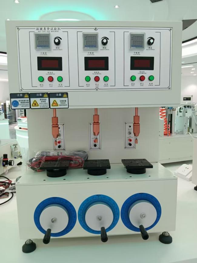 一、产品用途: 手机按键寿命试验机可对手机、MP3、电脑、电子词典、摇控器、橡胶按键等做快速寿命测试, 适用于检测按键开关、轻触开关、薄膜按键等各类按键进行寿命试验。具有速度可调,次数任意设定 ,同时可测试数个产品及多点测试。另每 个按键可以设定不同压力及不同高度。 同时用每个测试头分开控制,专用夹具设计,人性化操作,可满足客户不同测试需求 二、技术参数: